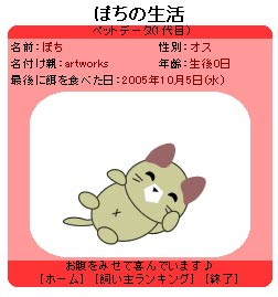 | PET ROOMはネット上で、一匹のペットを育てるゲームです。通常の育成ゲームは一人で育てますが、このゲームは不特定多数の人が育成に関わってきます。ですから、あなたの知らないところで、ペットが可愛がられたりいじめられたり、性格が良くも悪くも変化していきます。また飼い主ランキングによって誰が一番なつかれているか、嫌われているかなどがわかります。 |